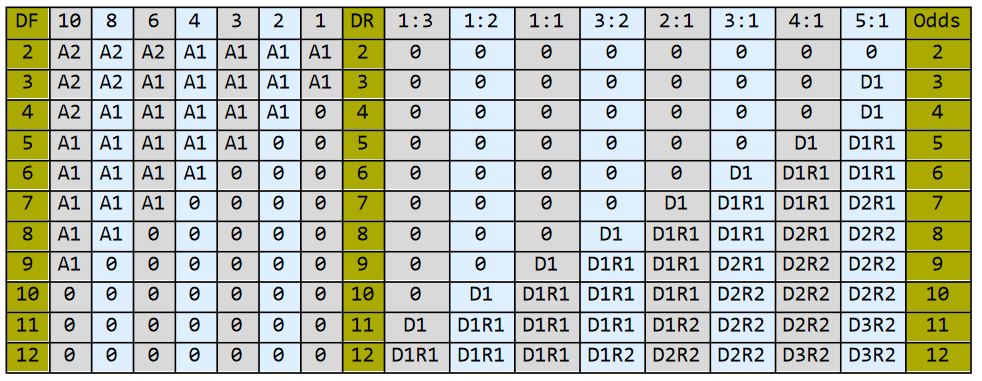 This 2 sided CRT uses the best defense factor of any defending unit to determine the left hand side column, which governs attacker losses. The ratio of total attacker strength to this same best defense factor unit determines the odds column used on the right hand side of the CRT, which governs defender losses and retreat results. The results are 2-12, but 3D6 are actually rolled, of 3 different colors. The white die is shared by both totals on the two sides of the table, while the red die is only used for the right side result and the green (or blue) die is only used for the left side result. E.g. a roll of white 3, red 2, green 4 would use the “5” row for the RHS result and the “7” row for the LHS result. Notice, this doesn’t change the expectation on either side of the table, it just establishes a weaker correlation between high attacker losses and low defender losses than you’d get from just 2D6. Sometimes you will get higher losses to both sides, and sometimes lower losses and an indecisive combat.